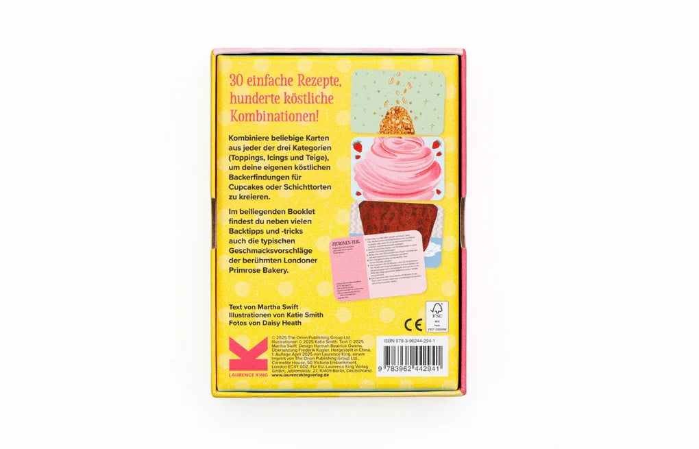 30 einfache Rezepte, hunderte köstliche Kreationen! Kombiniert beliebige Karten aus jeder der drei Kategorien (Toppings, Icings und Teige), um eure eigenen köstlichen Backerfindungen zu kreieren - von Cupcakes bis zu Schichttorten. Im beiliegenden Booklet findet ihr neben vielen Backtipps und -tricks auch die typischen Geschmacksvorschläge der berühmten Londoner Primrose Bakery.