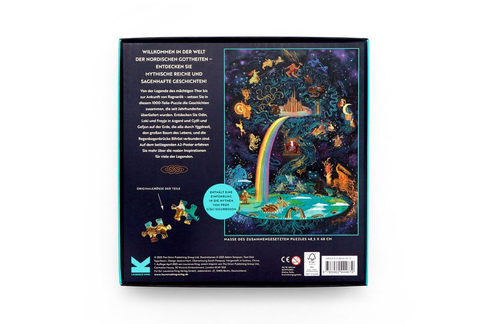 Wie gut kennt ihr die nordische Mythologie? Entdeckt mythische Reiche und sagenhafte Geschichten - von der Legende des mächtigen Thor bis zur Ankunft von Ragnarök. Setzt in diesem 1000-Teile-Puzzle die Geschichten zusammen, die seit Jahrhunderten überliefert werden. Entdeckt Odin, Loki und Freyja in Asgard und Gylfi und Gefjon auf der Erde, die alle durch Yggdrasil, den großen Baum des Lebens, und die brennende Regenbogenbrücke Bifröst verbunden sind. Auf dem beiliegenden A2-Poster erfahrt ihr mehr über die realen Inspirationen für viele der Legenden.