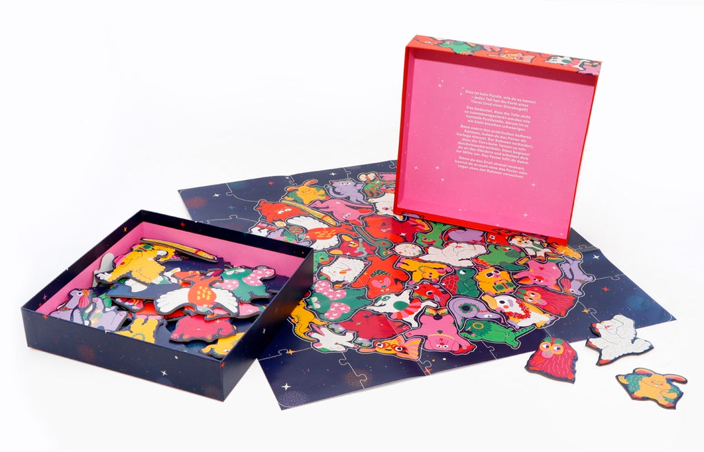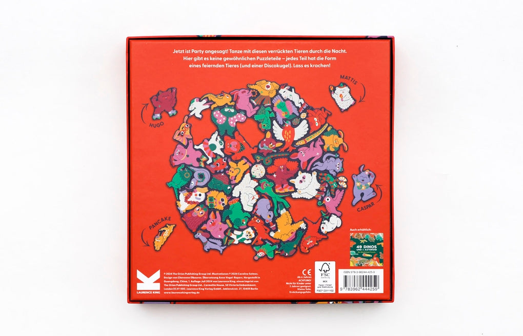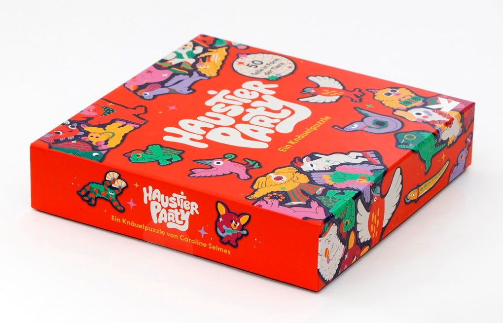 Hier geht die Post ab! 50 Haustiere feiern eine Party und jedes Puzzleteil hat die Form des jeweiligen Tieres. Ein Rahmen hält die große Sause zusammen und erleichtert das Puzzeln. Könnt ihr die glitzernde Discokugel zwischen den Haustieren entdecken? Partyhut nicht vergessen!