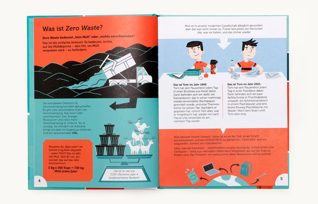 In retro-modernem Stil, mit 30 kindgerechten Herausforderungen zur Abfallreduzierung, z.B. Basteln von Taschen aus alten T-Shirts, und Tipps, wie man durch einfache Verhaltensänderungen schon viel erreichen kann.