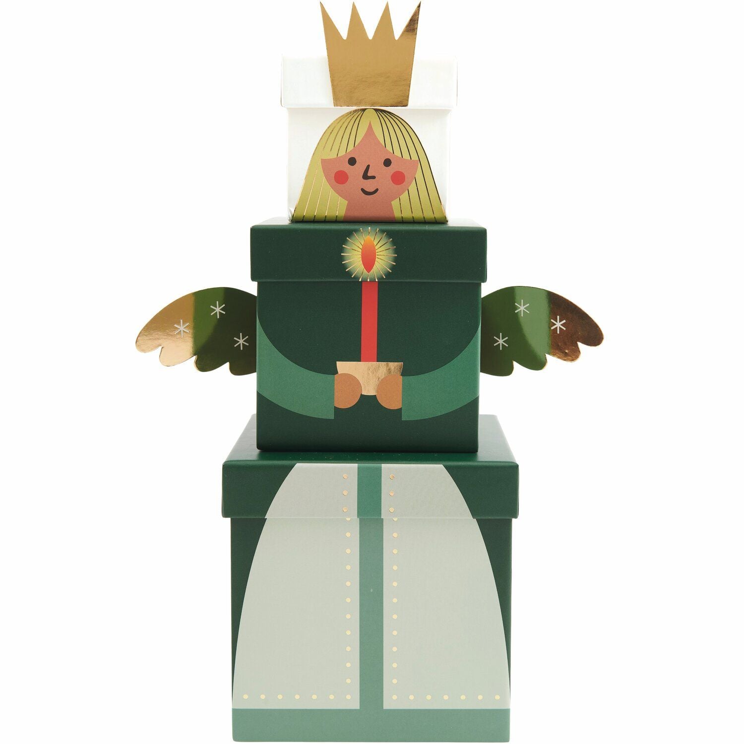 Das Geschenkboxen-Set Engel besteht aus stapelbaren Boxen mit einer eleganten Hot Foil Veredelung. Die beiliegenden, beidseitig gestalteten Papierteile für Krone und Flügel sind mit Klebestreifen versehen und können ganz leicht aufgeklebt werden und verleihen den Boxen eine besonders festliche Note. Werden die drei Boxen in den unterschiedlichen Größen zu einer Pyramide zusammengesetzt, ergibt das einen niedlichen Engel.