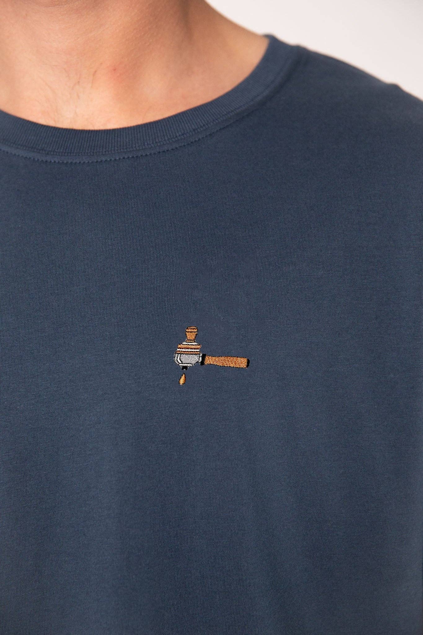 Super hochwertiges Bio Baumwoll Unisex T-Shirt mit schwerem Stoff (190gsm) und gesticktem Siebträger & Tamper Design